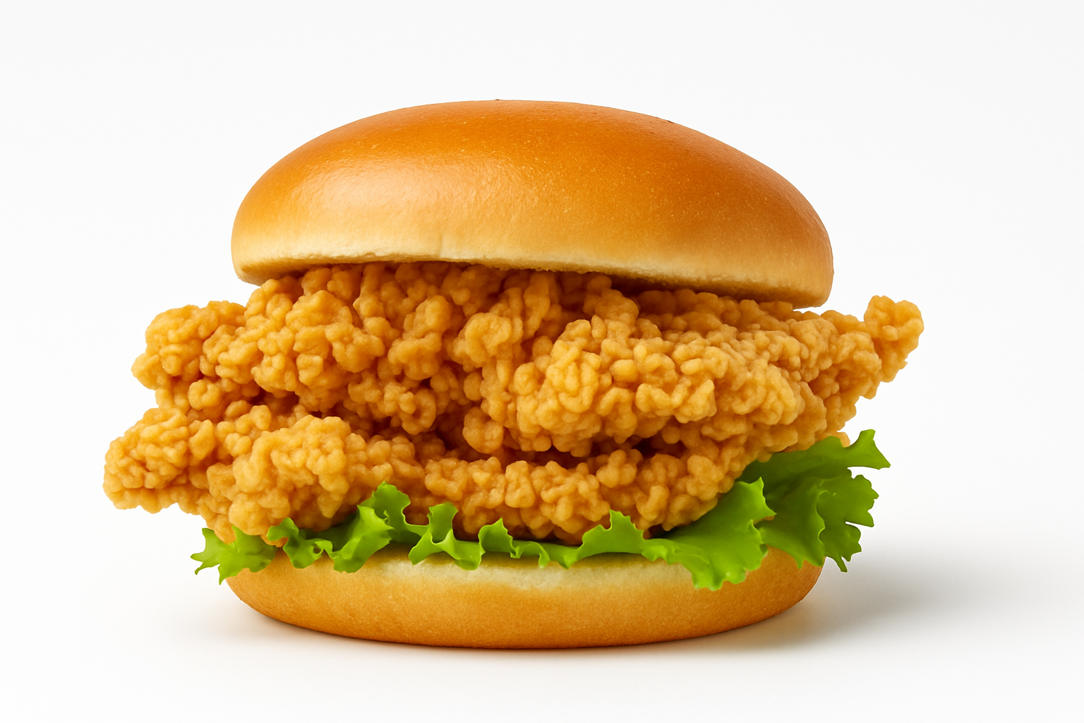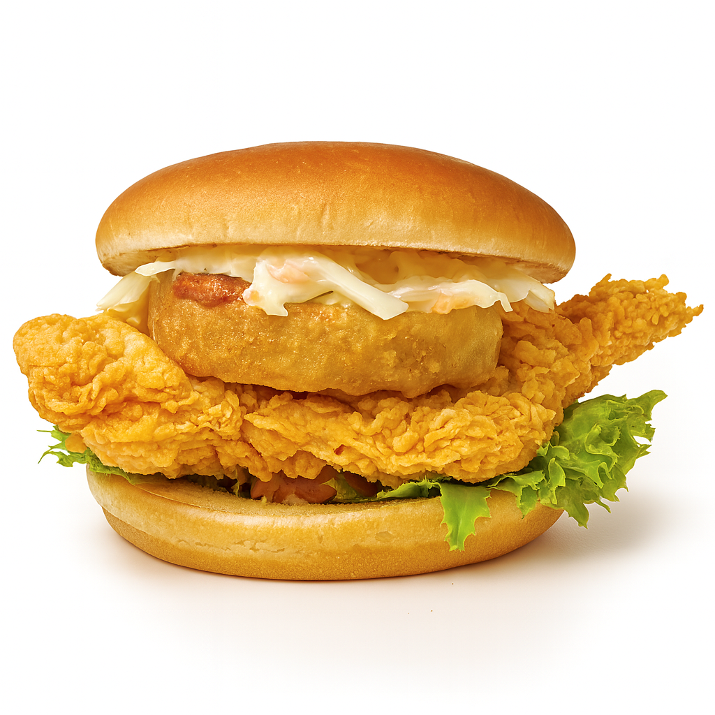 Crispy fried chicken topped with crunchy onion rings, fresh lettuce, creamy slaw, and our signature house sauce — all stacked inside a toasted bun. Big crunch, bold flavour, unbeatable bite.