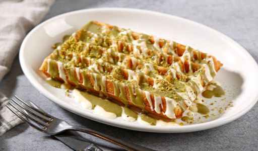 Silky pistachio sauce, crushed pistachios, white chocolate curls, and a scoop of pistachio gelato.