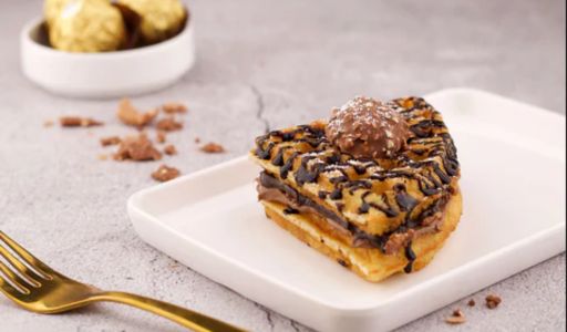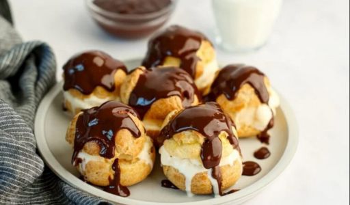 Delicate choux pastry buns filled with smooth mascarpone cream on a bed of hazelnut chocolate, finished with a milk chocolate drizzle & whipped cream.